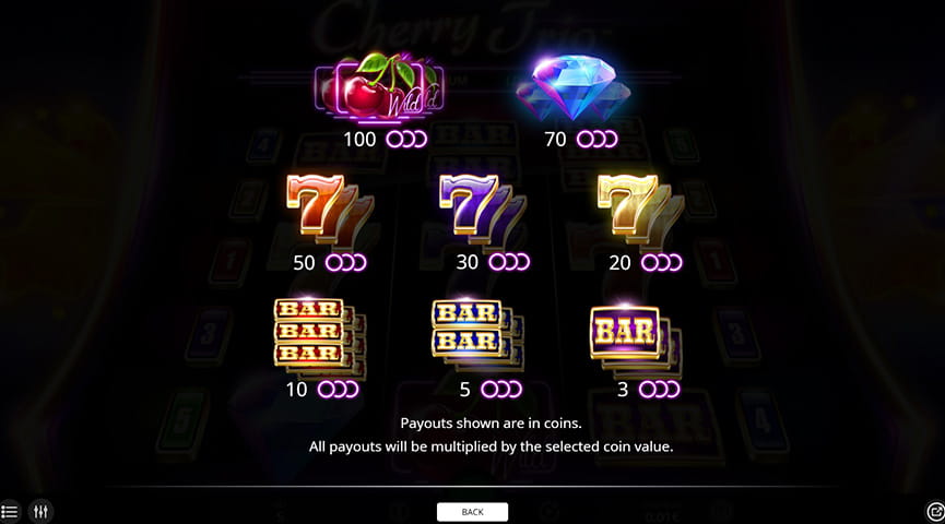 Cherry Trio სლოტი მიეკუთვნება კლასიკურ სლოტებს 3×3-ზე განლაგებით, 3 ბორბალითა და 5 გადახდის ხაზით. ვიდეო სლოტებისგან განსხვავებით მსგავსი სლოტის წესები უფრო მარტივია გასაგებად და დასამახსოვრებლად. თამაშის წესების ნახვა შეგიძლიათ ინფორმაციის ღილაკზე ხელის დაჭერით. სლოტში ჯამში 8 სიმბოლოა, რომელთა 3-ჯერ ამოსვლის შემთხვევაში გადახდის ხაზებზე, თქვენი დადებული ფსონი მრავლდება იმ კოეფიციენტზე, რომელიც შეესაბამება შესაბამის სიმბოლოს.